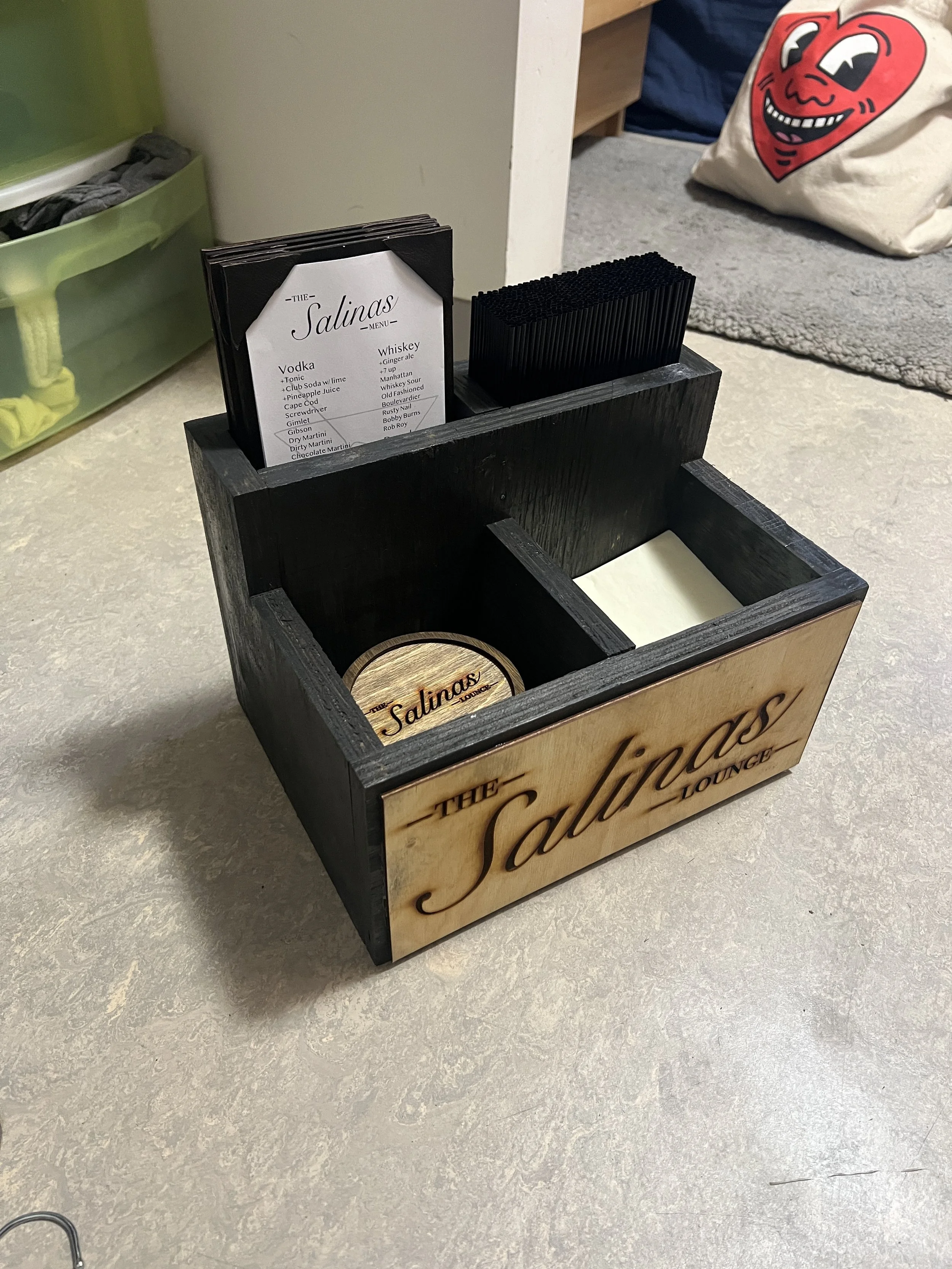 A inside joke between me and a close friend was calling his home bar The Salinas Lounge. I made them a custom bar caddy, menus, coasters, and cocktail napkins.