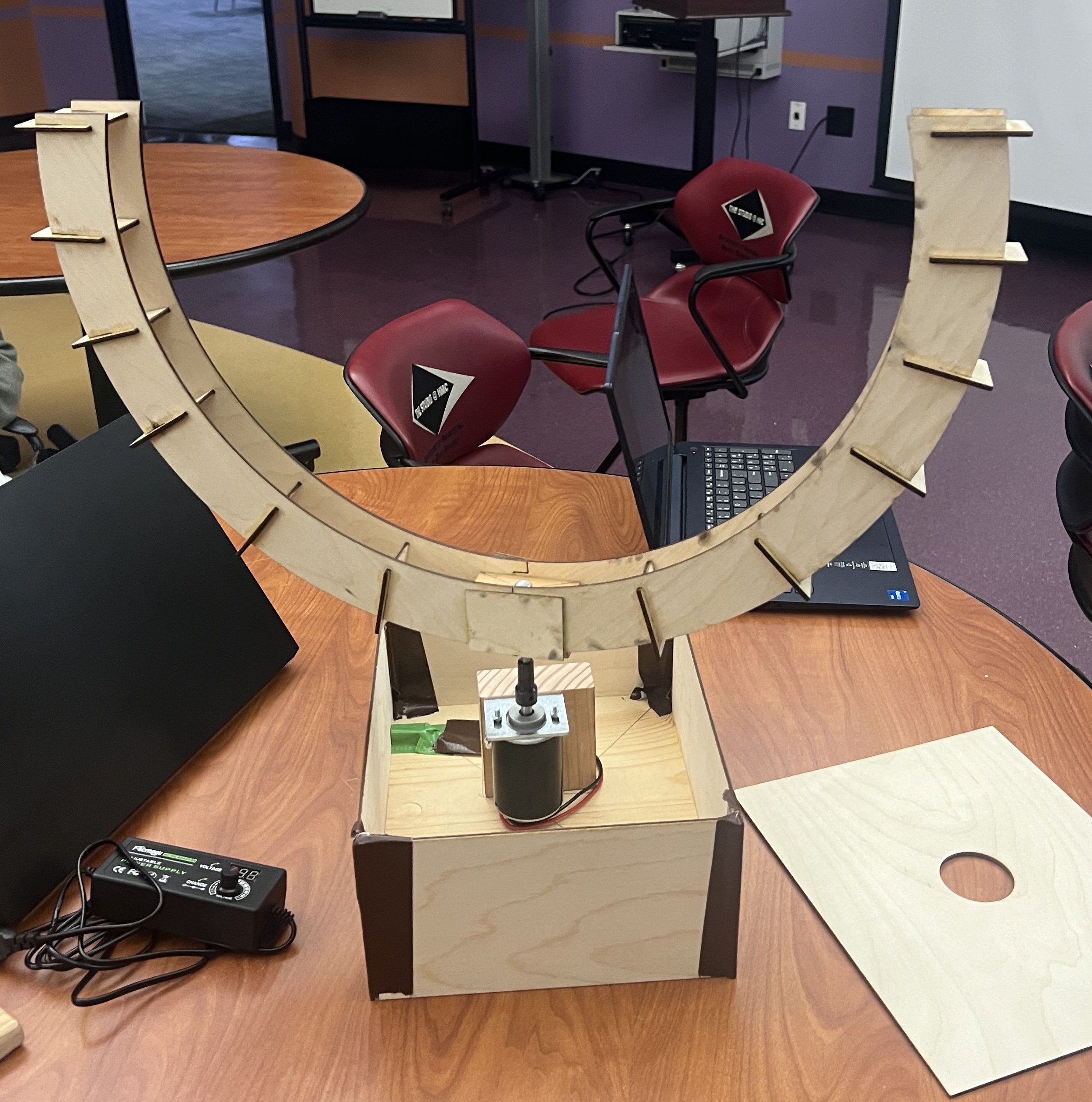 Built a track-and-ball system to visualize how centripetal force governs circular motion. As the ball traveled along the ring, its motion illustrated the balance between velocity, radial force, and gravity, producing oscillations when displaced from equilibrium. The demo served as a hands-on teaching tool to show the physics of curved motion in an engaging, interactive way.