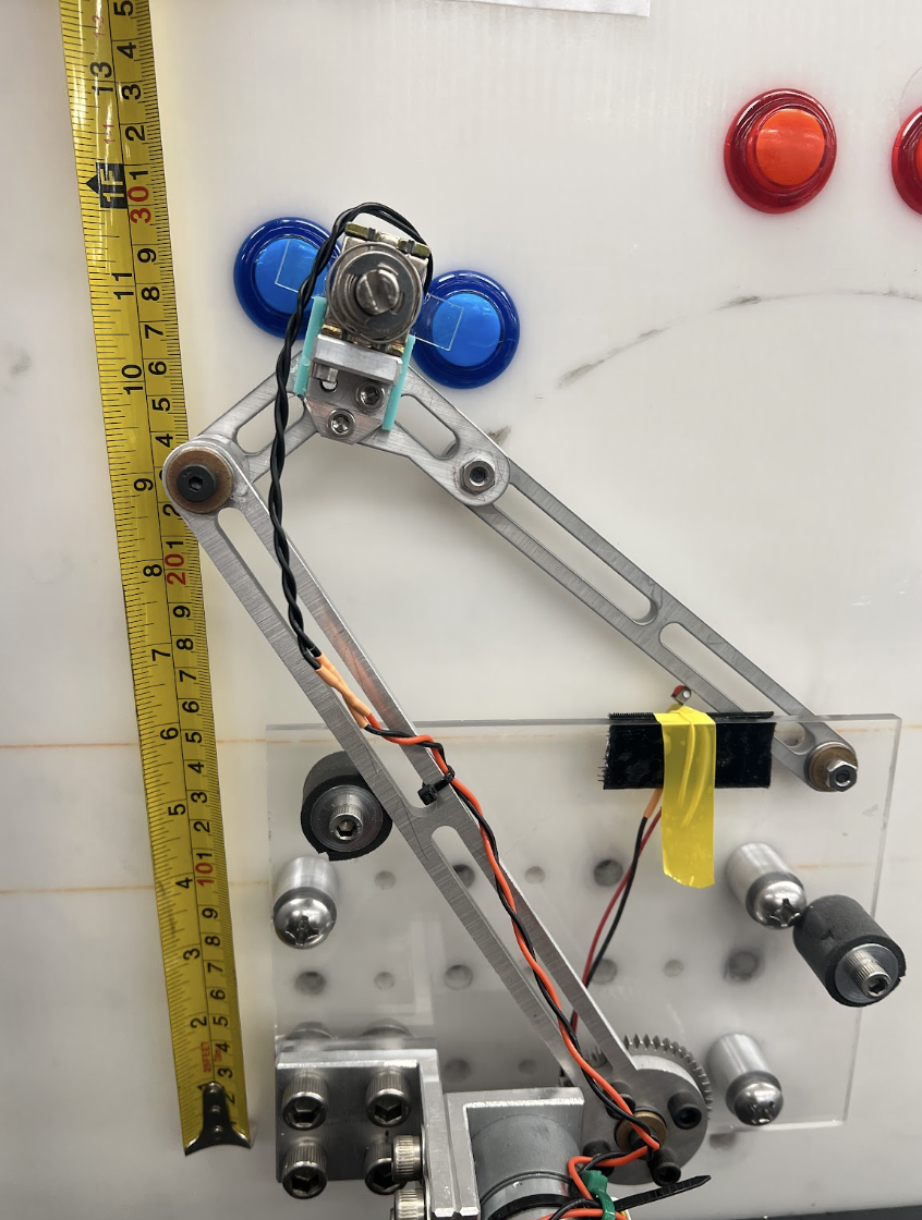 For this project my team designed, fabricated, and tested a four bar linkage capable of automatically pressing arcade buttons rapidly and accurately as possible within a one minute time constraint. The system identified color signals from an Arduino controlled playing field and moved to the correct button pair using a closed loop position control system.